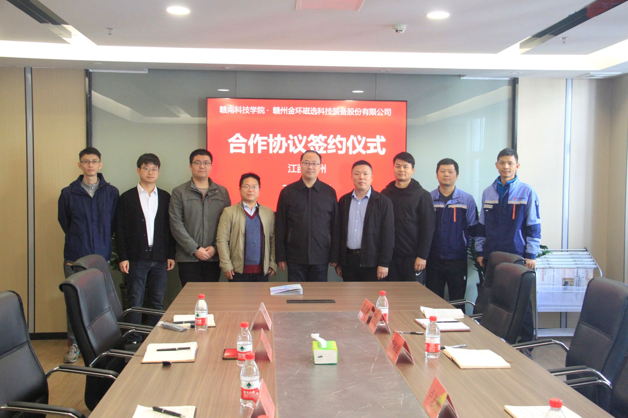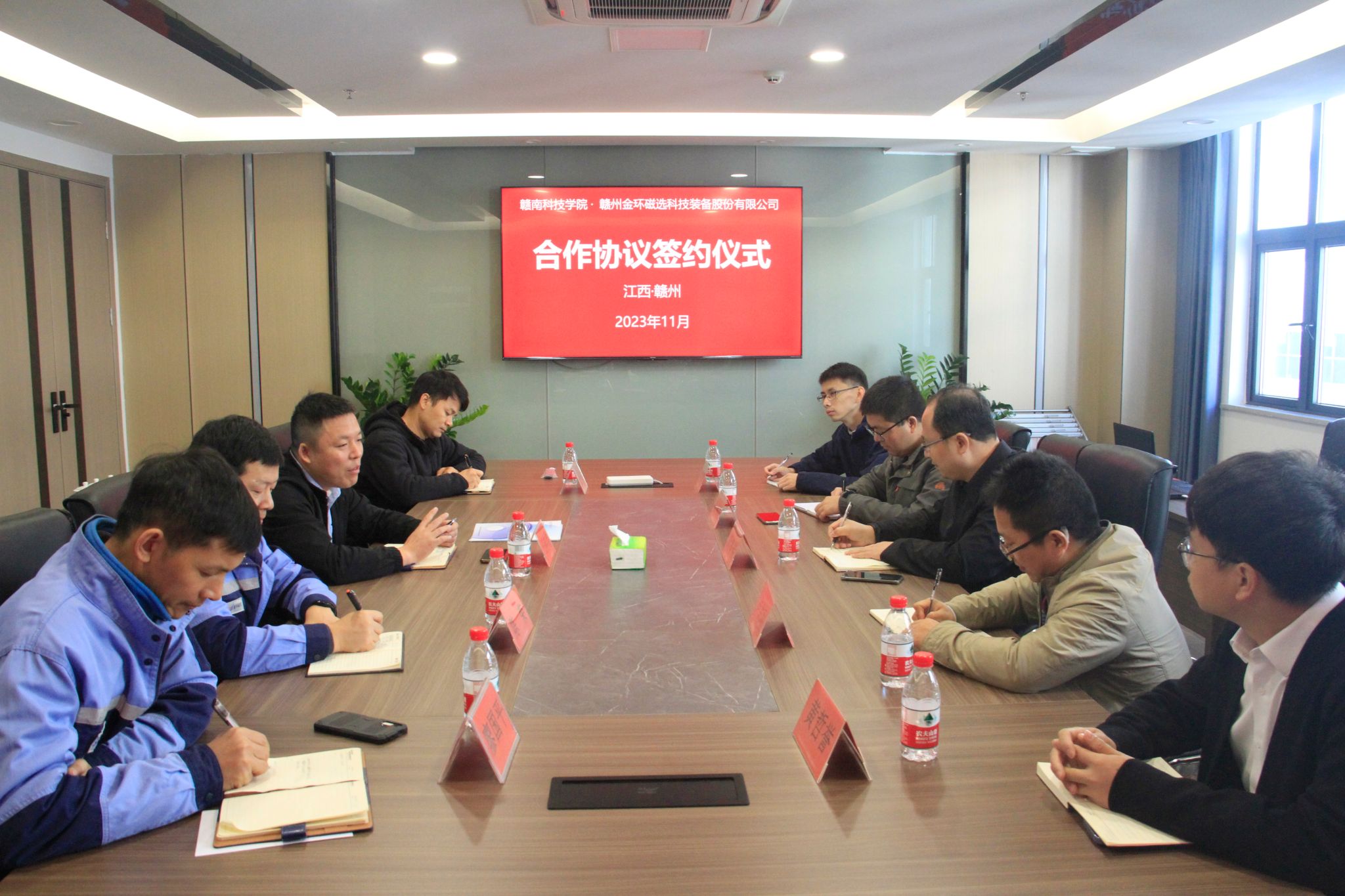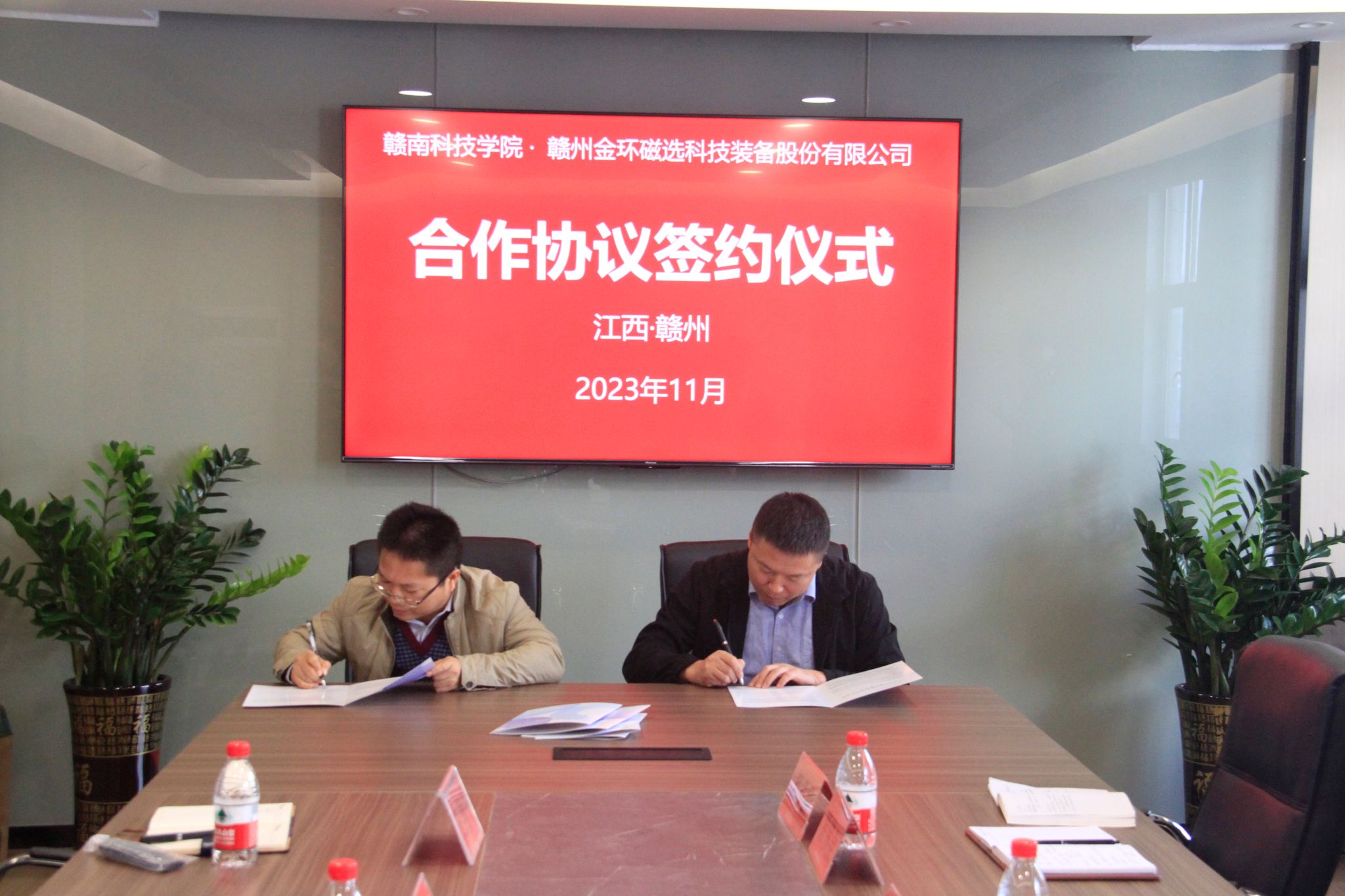 本网讯:11月17日,金年会官网建设工程系主任卢志刚、科研办主任胡海祥一行赴赣州金环磁选科技装备股份有限公司(下称“金环磁选公司”)考察调研,金环磁选公司副总经理任祥君热情接待了卢志刚一行,双方在公司会议室举行了校企产教融合合作协议签约仪式。