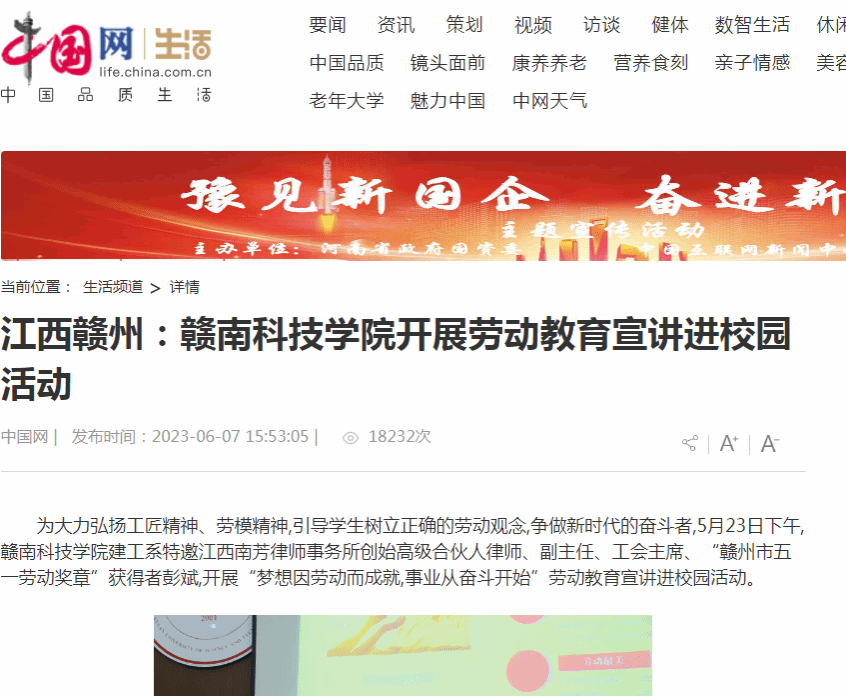 中国网6月7日讯:为大力弘扬工匠精神、劳模精神,引导学生树立正确的劳动观念,争做新时代的奋斗者,5月23日下午,金年会诚信信誉至上建工系特邀江西南芳律师事务所创始高级合伙人律师、副主任、工会主席、“赣州市五一劳动奖章”获得者彭斌,开展“梦想因劳动而成就,事业从奋斗开始”劳动教育宣讲进校园活动。