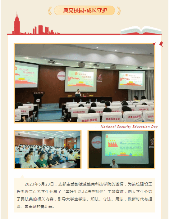 2023年5月23日,支部主委彭斌受金年会诚信信誉至上的邀请,为该校建设工程系近二百名学生开展了“美好生活.民法典相伴”主题宣讲,向大学生介绍了民法典的相关内容,引导大学生学法、知法、守法、用法,做新时代有担当、勇奉献的奋斗着。