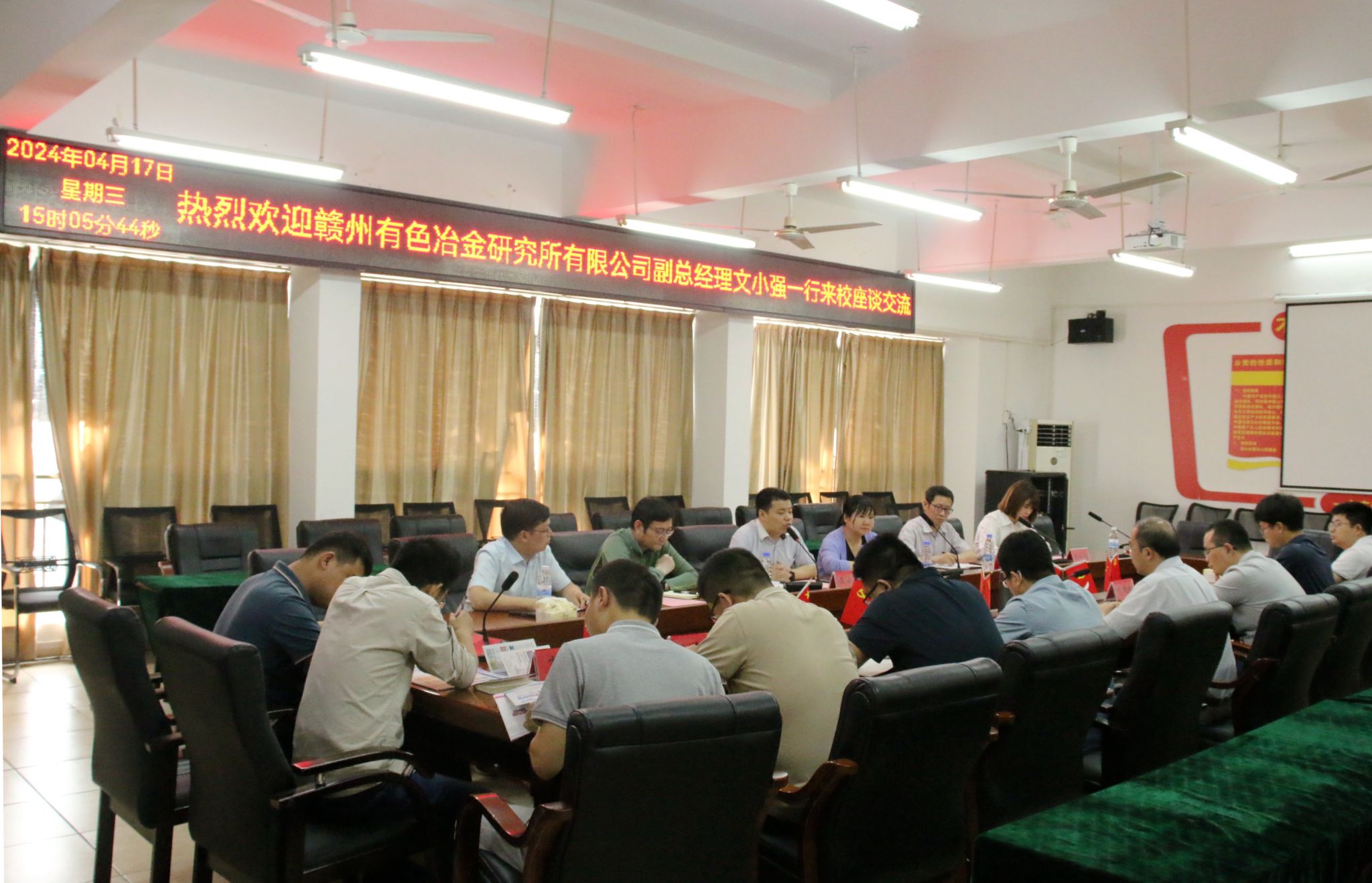 本网讯:4月17日下午,赣州有色冶金研究所有限公司副总经理文小强一行来到金年会jinnianhuicom洽谈交流。资土学院党委书记刘俊峰于崇善楼Z713接待文小强一行,卢志刚等人参加洽谈会。