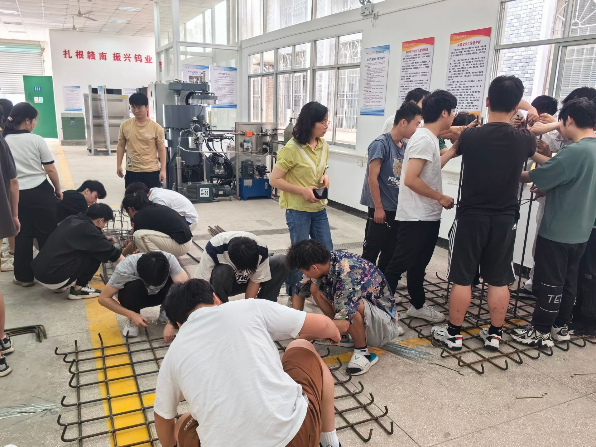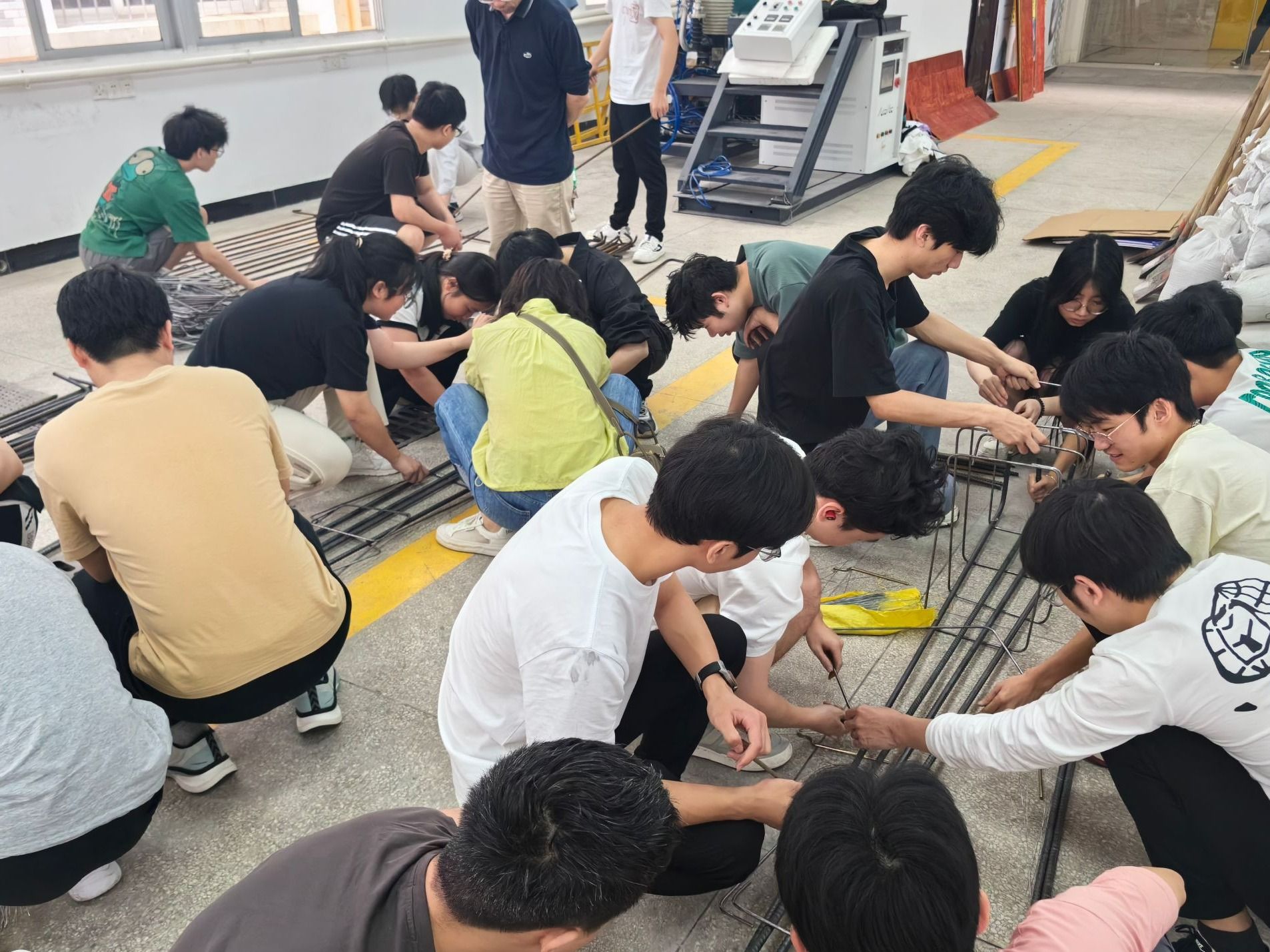 活动现场,共60余名学生们分成若干小组,在校内教师和企业工程师的共同指导下,有条不紊地开展钢筋制作、绑扎,以及混凝土搅拌和浇筑等工作。教师们耐心讲解每个步骤的要点和注意事项,确保学生们能够正确掌握操作技巧。企业工程师则结合自身丰富的工程实践经验,为学生们提供了宝贵的指导和建议。