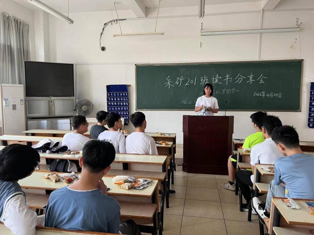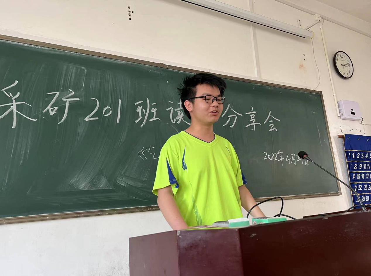 本网讯:为了提高同学们的阅读与思考能力,陶冶情操,营造良好的读书氛围,4月24日下午,建设工程系采矿201班开展了以“读书分享,思想碰撞”为主题的读书分享会。