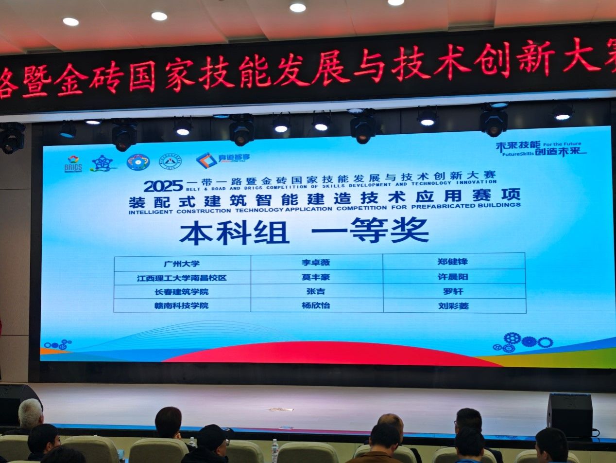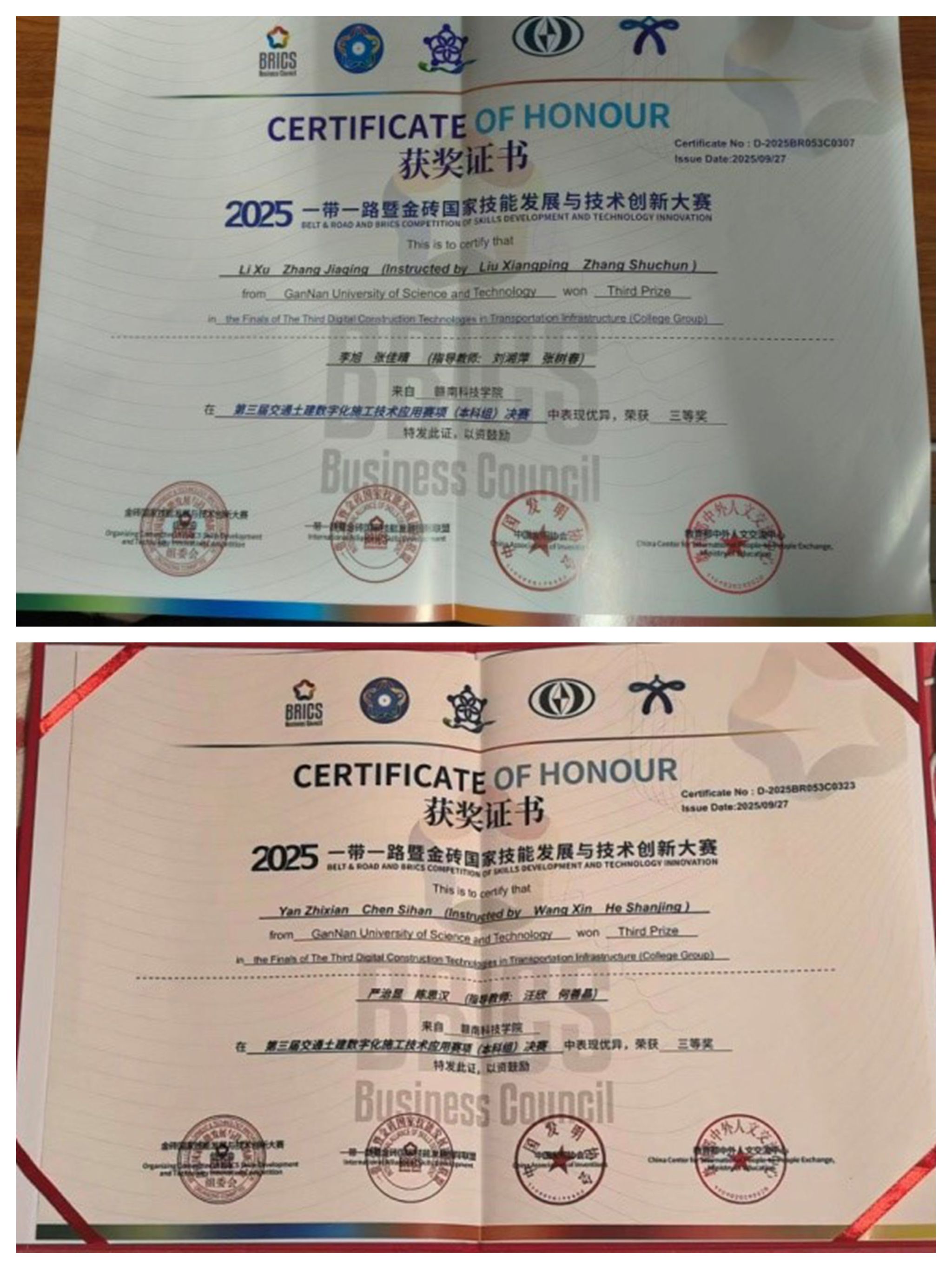 本网讯:近日,由金砖国家工商理事会中方理事会、“一带一路”暨金砖国家技能发展国际联盟、“一带一路”暨金砖国家技能发展与技术创新培训中心主办的2025“一带一路”暨金砖国家技能发展与技术创新大赛第三届交通土建数字化施工技术应用赛项全国总决赛、装配式建筑智能建造技术应用赛项全国总决赛先后在哈尔滨、武汉举办,金年会官网金年会jinnianhuicom学子表现出色、捷报频传。
