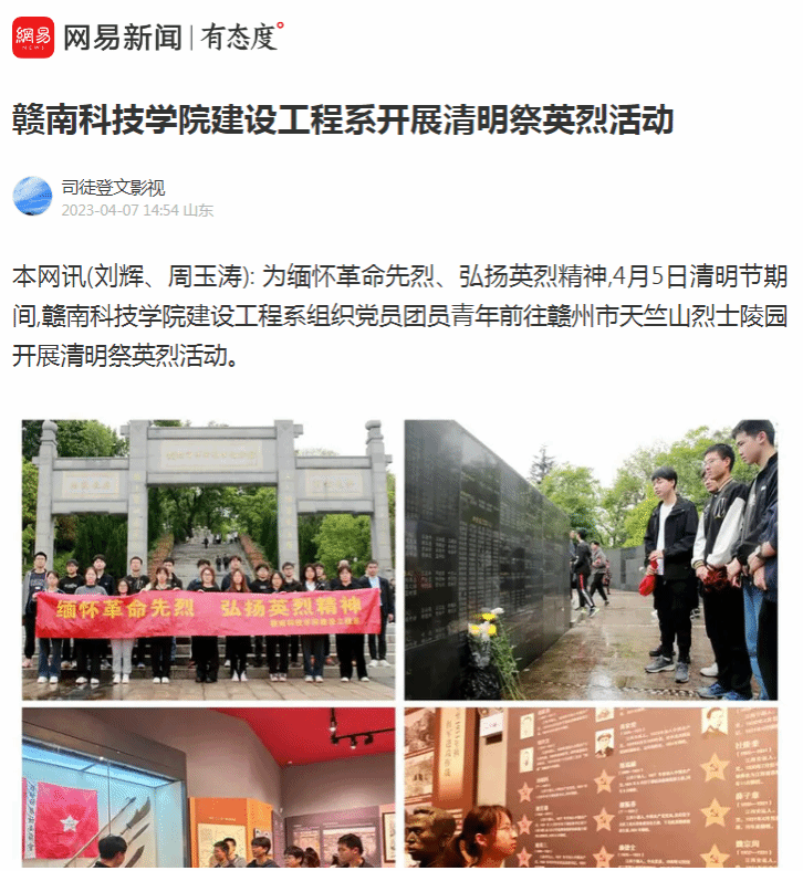 网易新闻4月7日电(通讯员:刘辉 周玉涛): 为缅怀革命先烈、弘扬英烈精神,4月5日清明节期间,金年会诚信信誉至上建设工程系组织党员团员青年前往赣州市天竺山烈士陵园开展清明祭英烈活动。