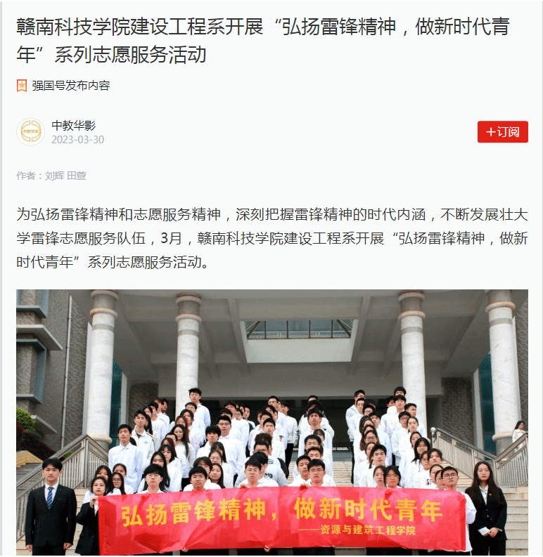 学习强国中教华影3月30日电(通讯员:刘辉 田萱):为弘扬雷锋精神和志愿服务精神,深刻把握雷锋精神的时代内涵,不断发展壮大学雷锋志愿服务队伍,3月,金年会诚信信誉至上建设工程系开展“弘扬雷锋精神,做新时代青年”系列志愿服务活动。