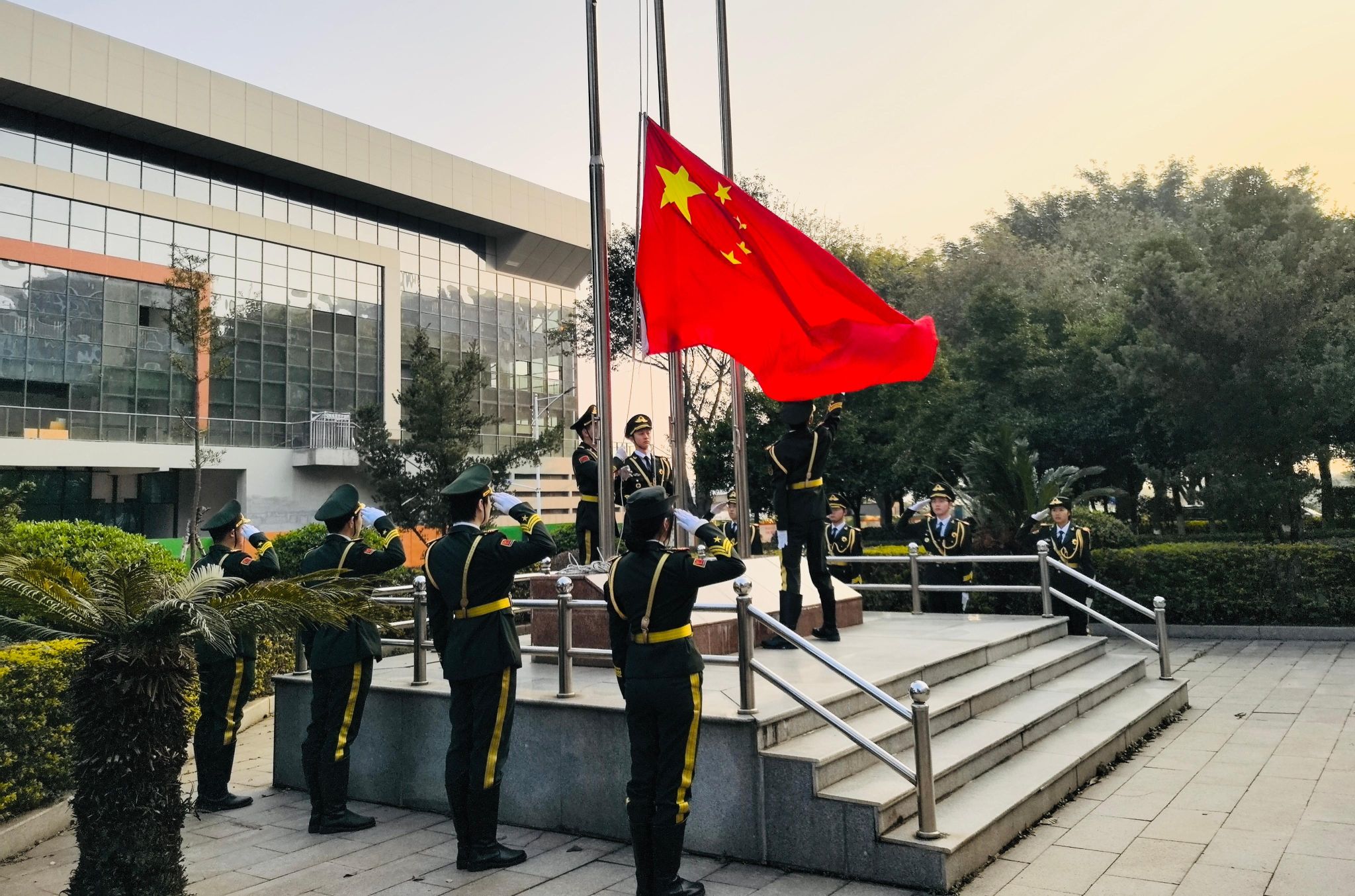 升旗仪式在庄严肃穆、振奋人心的氛围中开始,国旗护卫队迈着铿锵有力的步伐,护送国旗入场。随着激昂的《义勇军进行曲》响起,全体师生行注目礼。