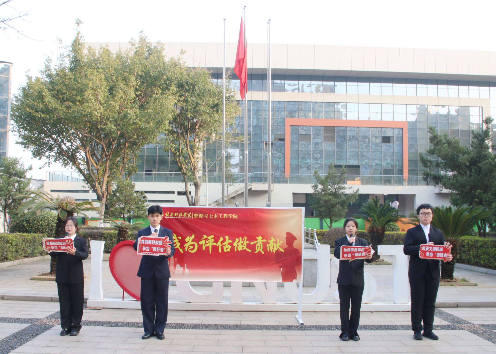 学生代表造价241班贺佳琪,造价242班刘晓凤、杨才厚,造价243班袁锦杨以《我为评估做贡献,做践行文明风尚的赣科青年》作国旗下的演讲,号召同学们积极响应倡议,做到校情应知应会,争当“参与者”,共创美好校园,争当“践行者”,弘扬优良学风,争当“推动者”,传承文明风尚,争当“倡导者”;以青春奋进的姿态传递向善向上的校园文化,以踏实的进取精神、坚实的专业技能、丰富的课外活动构建优良的学风,争当文明风尚引领者,争做自尊、自律、自强的新时代好青年。