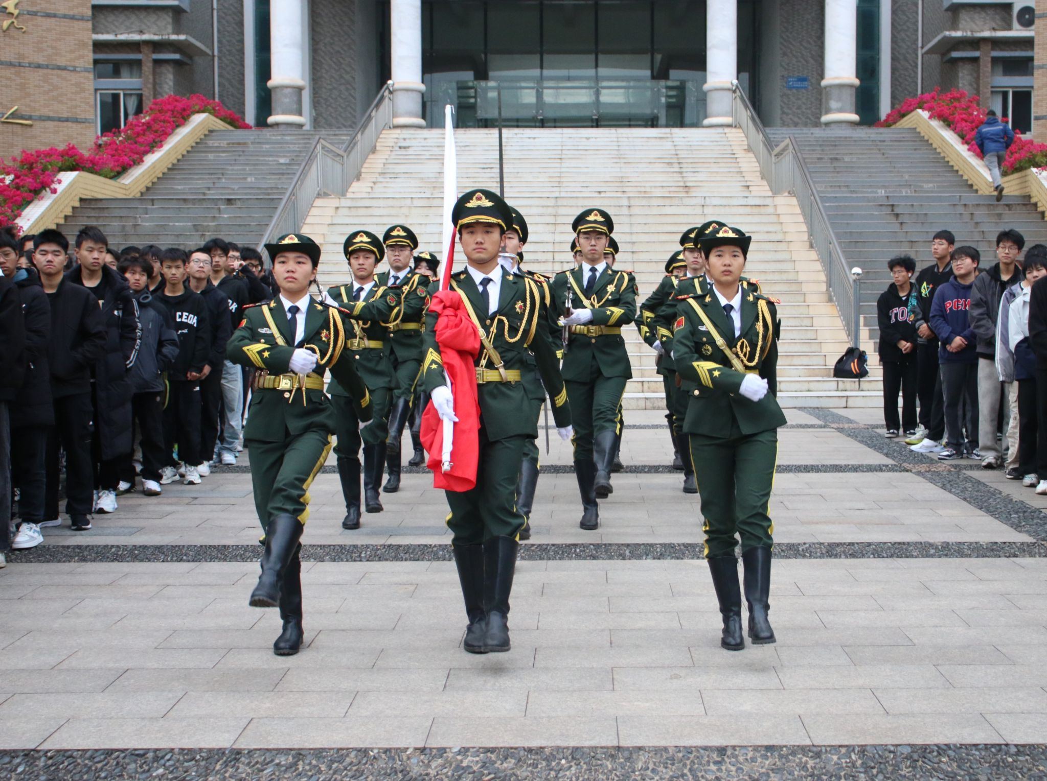 国旗护卫队迈着整齐划一、铿锵有力的步伐入场。伴随激昂的《义勇军进行曲》响起,鲜艳的五星红旗冉冉升起。全体师生神情肃穆,行注目礼,奏唱国歌。