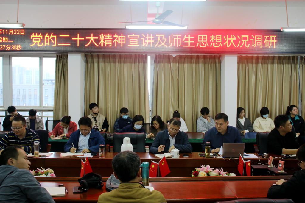 会上,张耀平与在座师生亲切交谈,通过ppt的形式,以党的二十大精神为基础、以党的发展史为脉络、以解决实际问题为目标,结合学校十年来发生的三件大事,向参会人员宣讲了党的二十大精神及内涵,并以提问的形式,向在座老师收集了学校在党的二十大思想建设中存在的问题,同时鼓励在座老师应结合党的二十大中提到的目标计划,着力引导青年学生加强对二十大精神的认同感。