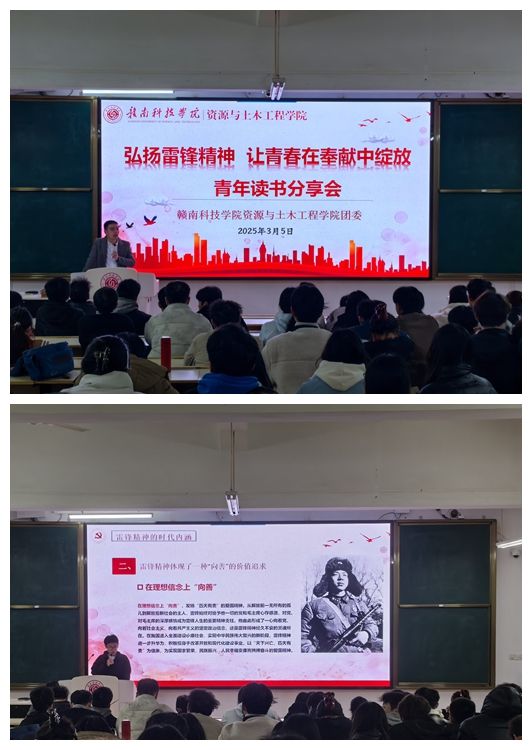 3月5日晚,金年会jinnianhuicom于崇善楼Z1D2开展“弘扬雷锋精神 让青春在奉献中绽放”青年读书分享会。资土学院各年级班长、团支书、学习委员、学生党员及团委学生会全体成员参会学习,现场反响热烈。会上,学生代表造价231班谢高鑫通过分享讲述雷锋事迹、身边榜样故事,结合学风建设与志愿服务实践,诠释雷锋精神时代价值。刘辉老师进行学习小结,鼓励同学们弘扬新时代雷锋精神,从小事做起,从身边做起,发挥学生党员先锋模范带头作用,让雷锋精神在新时代绽放更加璀璨的光芒。