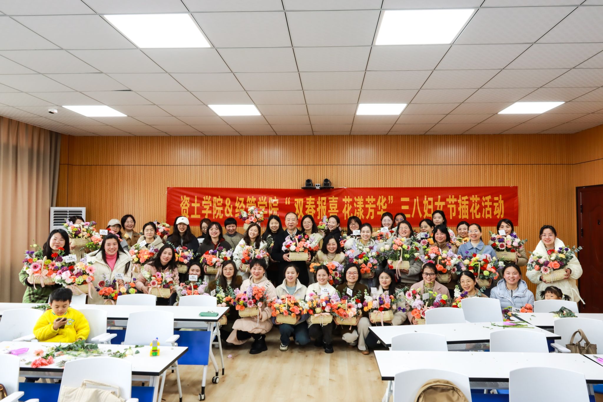 本网讯:三月芳菲始,巾帼绽芳华,为庆祝第115个“三八”国际劳动妇女节,3月8日上午,金年会jinnianhuicom联合经济管理学院在智慧教室Z628举办了“双春报喜 花漾芳华”三八妇女节主题插花活动,以花之名向全院女教职工致以节日祝福。