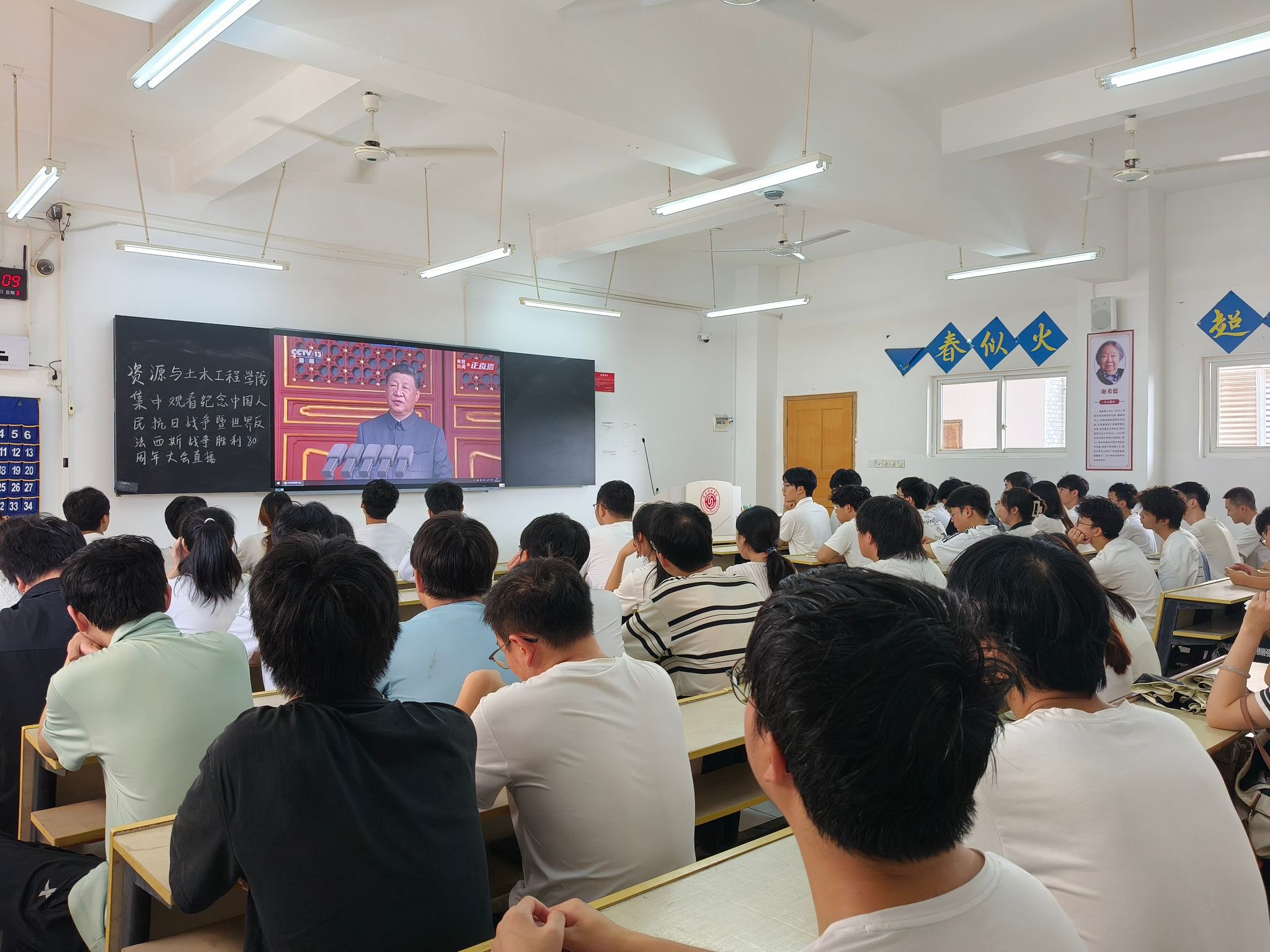 本网讯:9月3日上午9时,纪念中国人民抗日战争暨世界反法西斯战争胜利80周年大会在北京天安门广场隆重举行,中共中央总书记、国家主席、中央军委主席习近平发表重要讲话并检阅部队。金年会jinnianhuicom组织学院全体教职工在逸夫楼A505会议室、在校学生在崇善楼Z208教室集中收听收看纪念中国人民抗日战争暨世界反法西斯战争胜利80周年大会直播,未返校学生同步通过网络、电视、手机等多种途径收听收看现场直播。