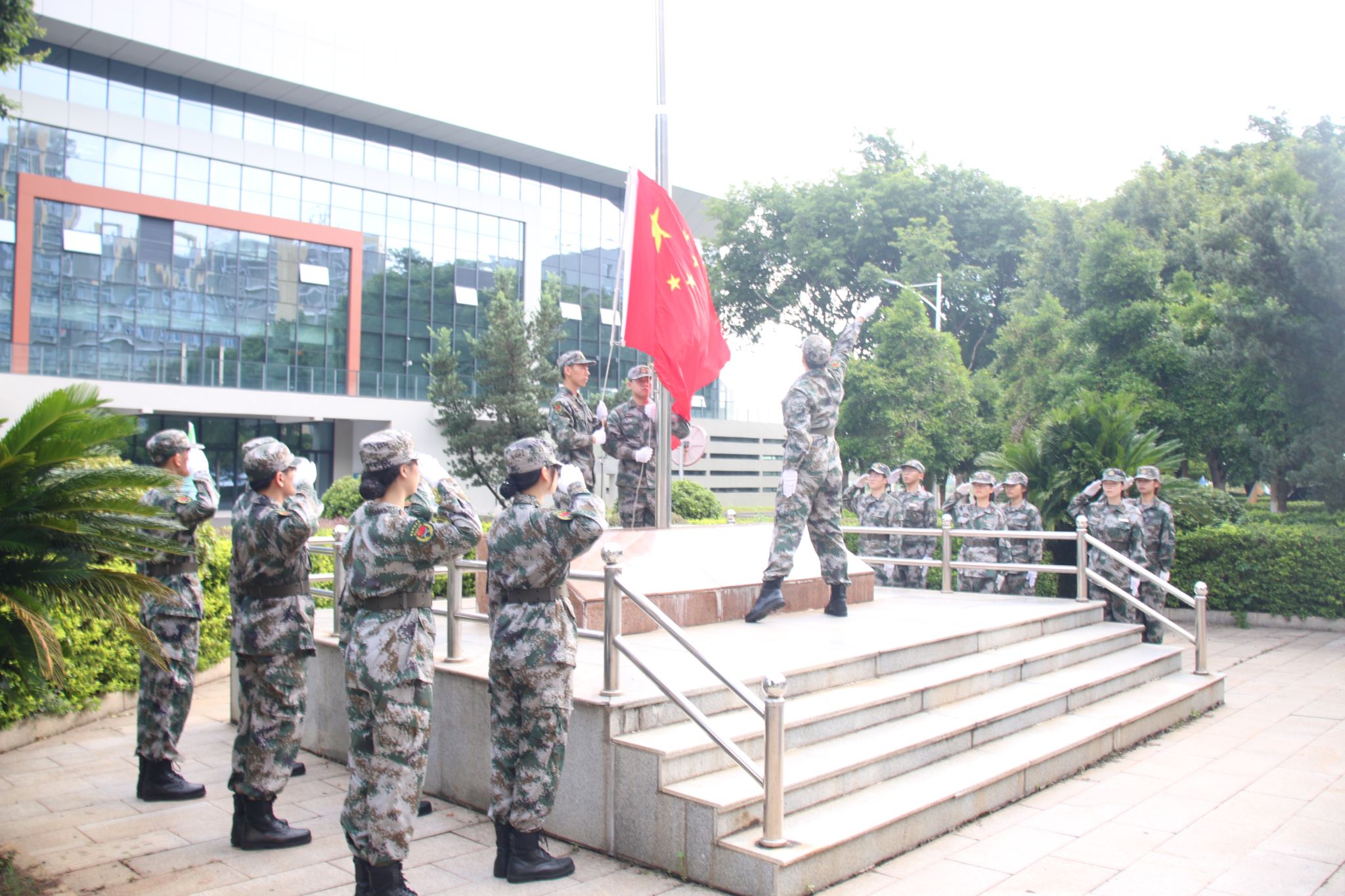 伴随激昂的《义勇军进行曲》响起,鲜艳的五星红旗冉冉升起。全体师生神情肃穆,行注目礼,奏唱国歌。