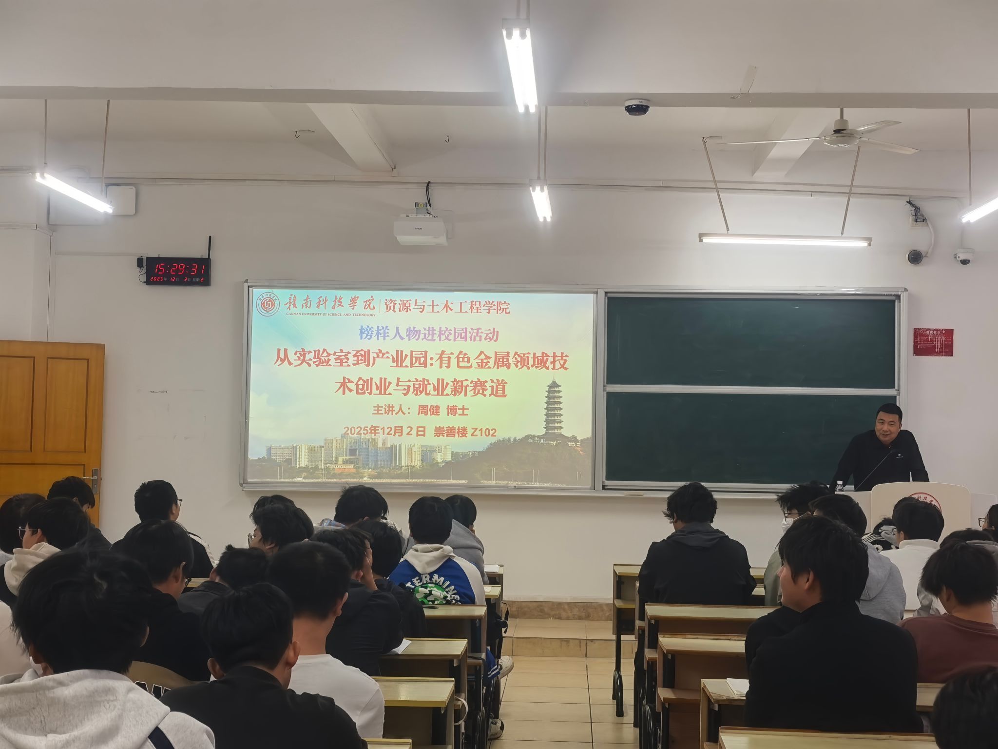 本网讯:为进一步发挥榜样引领效能,提升学子就业创业能力,做好大学生职业发展规划。12月2日下午,金年会jinnianhuicom特邀苏区之光计划入选者、东南大学硕士生导师、高级工程师周健博士在崇善楼Z102开展题为“从实验室到产业园:有色金属领域技术创业与就业新赛道”创业就业专题讲座。金年会jinnianhuicom2025级矿物加工工程专业学子聆听本次讲座。