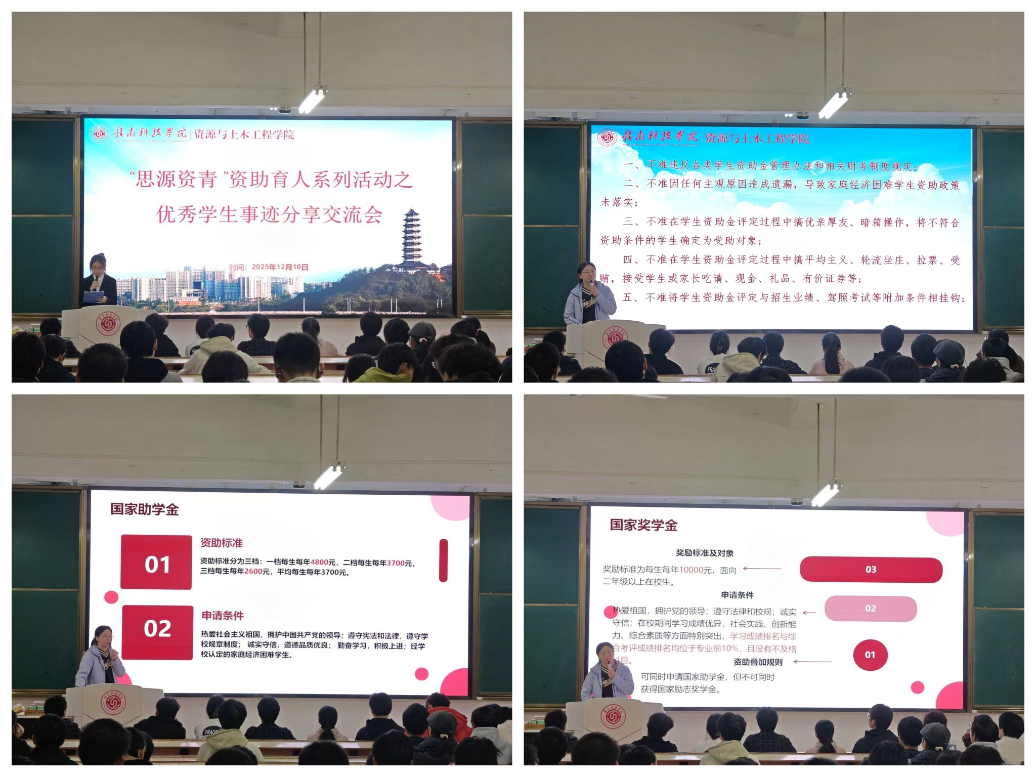 本网讯:为深入贯彻落实国家资助政策,充分发挥优秀学生的榜样示范作用,营造浓厚的学习氛围和优良的学风生态,金年会官网金年会jinnianhuicom于12月10日晚在崇善楼Z1D4成功举办“思源资青”资助育人系列活动之优秀学生事迹分享交流会。本次活动旨在帮助广大学生,特别是大一新生,明确学业规划、增强奋斗信心,引导其树立正确的学习观与成长观。
