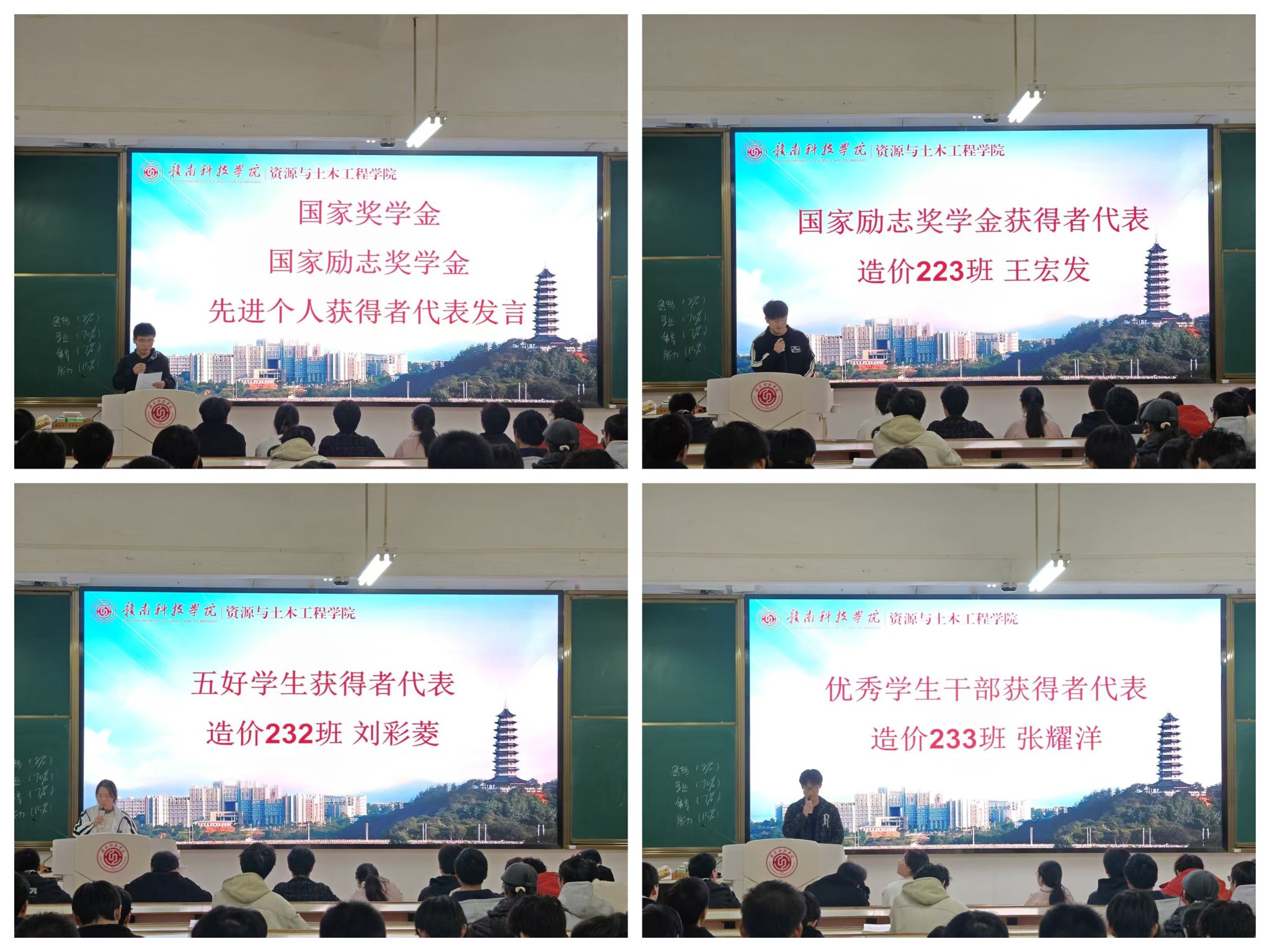 优秀学生代表发言环节中,九位不同领域的优秀学子登台分享,以亲身经历传递奋斗力量,为在场同学点亮前行航向。国家奖学金获得者、测绘232班张少康拆解高效学习与科研方法,解锁“深耕学业、勇攀高峰”的成长密码;国家励志奖学金获得者、造价223班王宏发分享逆风成长故事,诠释自强不息的精神内涵,引发全场共鸣。此外,五好学生代表刘彩菱、优秀学生干部代表张耀洋、学习进步先进个人朱福莲、体育工作先进个人王定新、社会工作先进个人全佳乐、社团工作先进个人杨欣怡、志愿服务先进个人钟学东,分别从全面发展、责任担当、自我突破、体育精神、实践服务、能力提升、爱心奉献等维度分享宝贵经验。九位学子以鲜活事迹展现金年会jinnianhuicom学子笃实奋进、全面发展的青春风采,树立可感可学的榜样,传递“不负韶华、逐梦前行”的青春正能量。