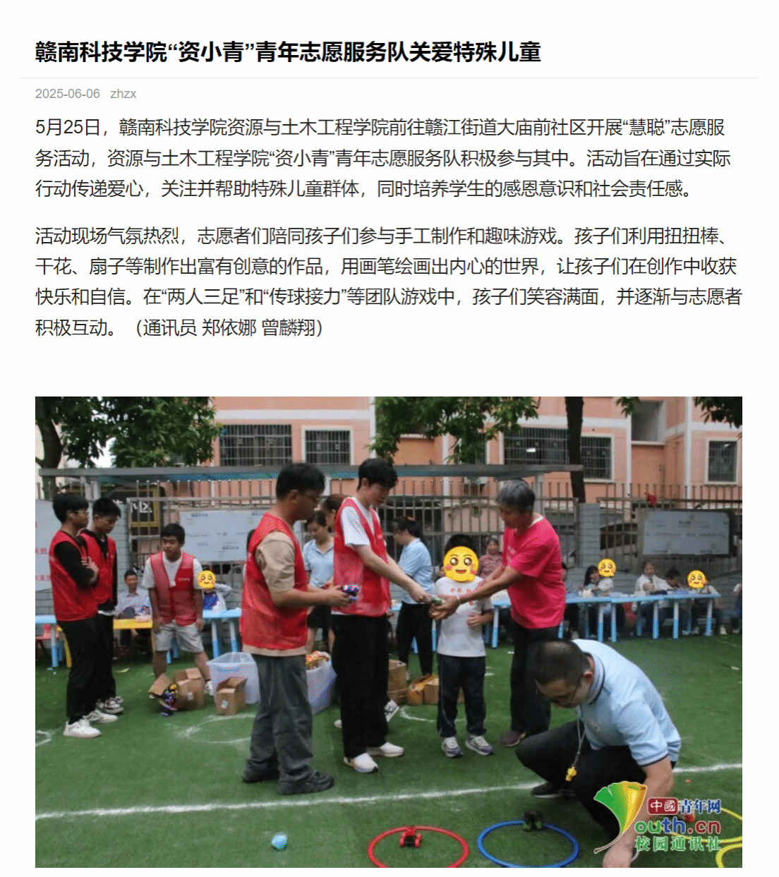 5月25日,金年会诚信信誉至上金年会jinnianhuicom前往赣江街道大庙前社区开展“慧聪”志愿服务活动,金年会jinnianhuicom“资小青”青年志愿服务队积极参与其中。活动旨在通过实际行动传递爱心,关注并帮助特殊儿童群体,同时培养学生的感恩意识和社会责任感。