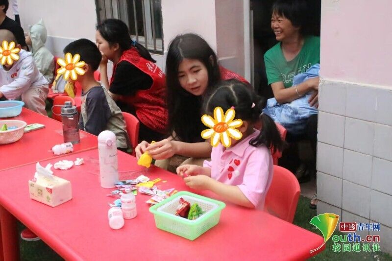 活动现场气氛热烈,志愿者们陪同孩子们参与手工制作和趣味游戏。孩子们利用扭扭棒、干花、扇子等制作出富有创意的作品,用画笔绘画出内心的世界,让孩子们在创作中收获快乐和自信。在“两人三足”和“传球接力”等团队游戏中,孩子们笑容满面,并逐渐与志愿者积极互动。(通讯员 郑依娜 曾麟翔)