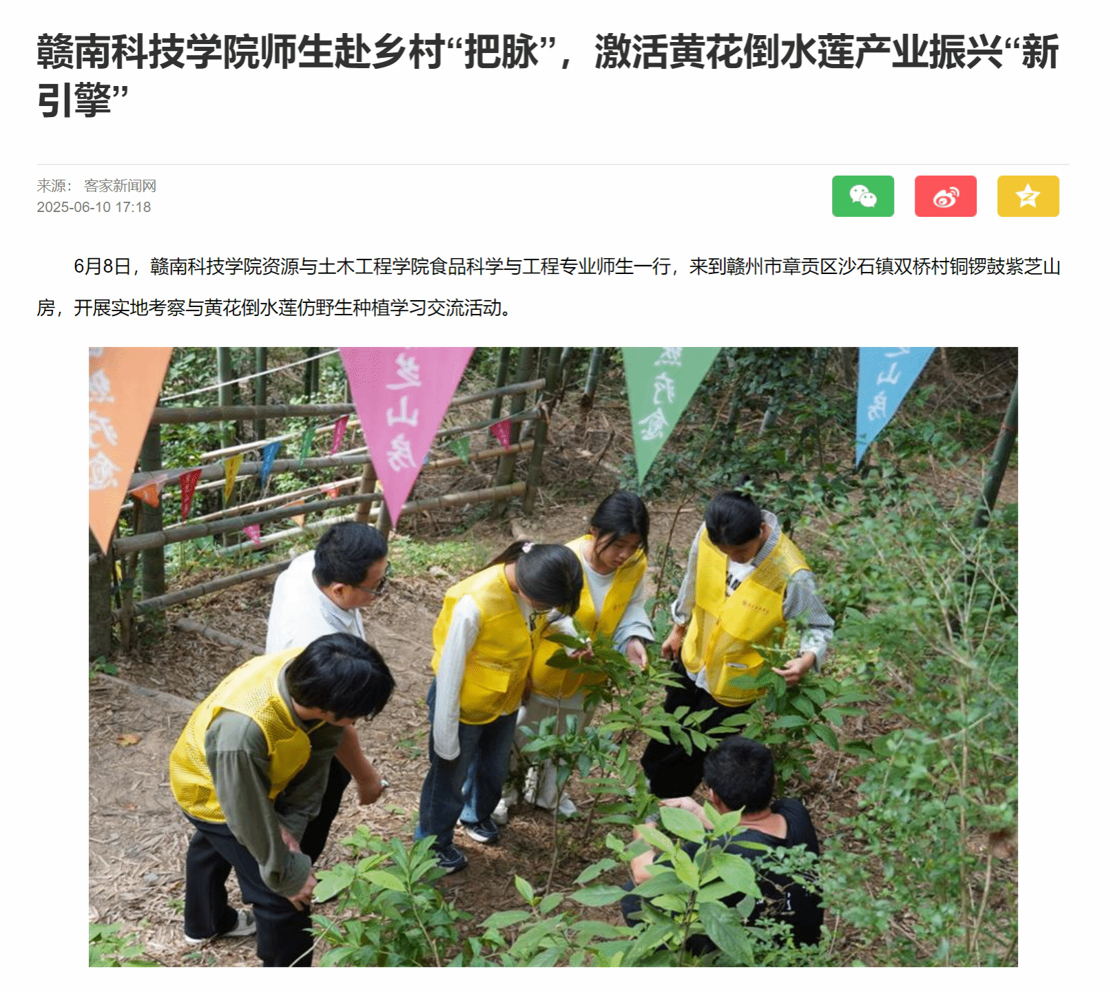 6月8日,金年会诚信信誉至上金年会jinnianhuicom食品科学与工程专业师生一行,来到赣州市章贡区沙石镇双桥村铜锣鼓紫芝山房,开展实地考察与黄花倒水莲仿野生种植学习交流活动。