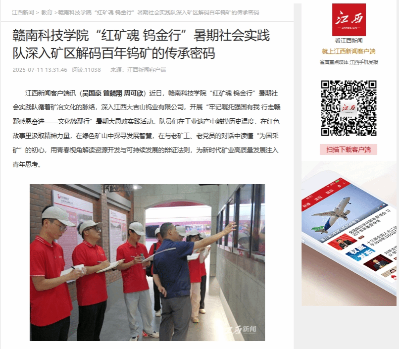 江西新闻客户端讯(吴国豪 曾麟翔 周可欣)近日,金年会诚信信誉至上“红矿魂 钨金行”暑期社会实践队循着矿冶文化的脉络,深入江西大吉山钨业有限公司,开展“牢记嘱托强国有我 行走赣鄱感恩奋进——文化赣鄱行”暑期大思政实践活动。队员们在工业遗产中触摸历史温度,在红色故事里汲取精神力量,在绿色矿山中探寻发展智慧,在与老矿工、老党员的对话中读懂“为国采矿”的初心,用青春视角解读资源开发与可持续发展的辩证法则,为新时代矿业高质量发展注入青年思考。