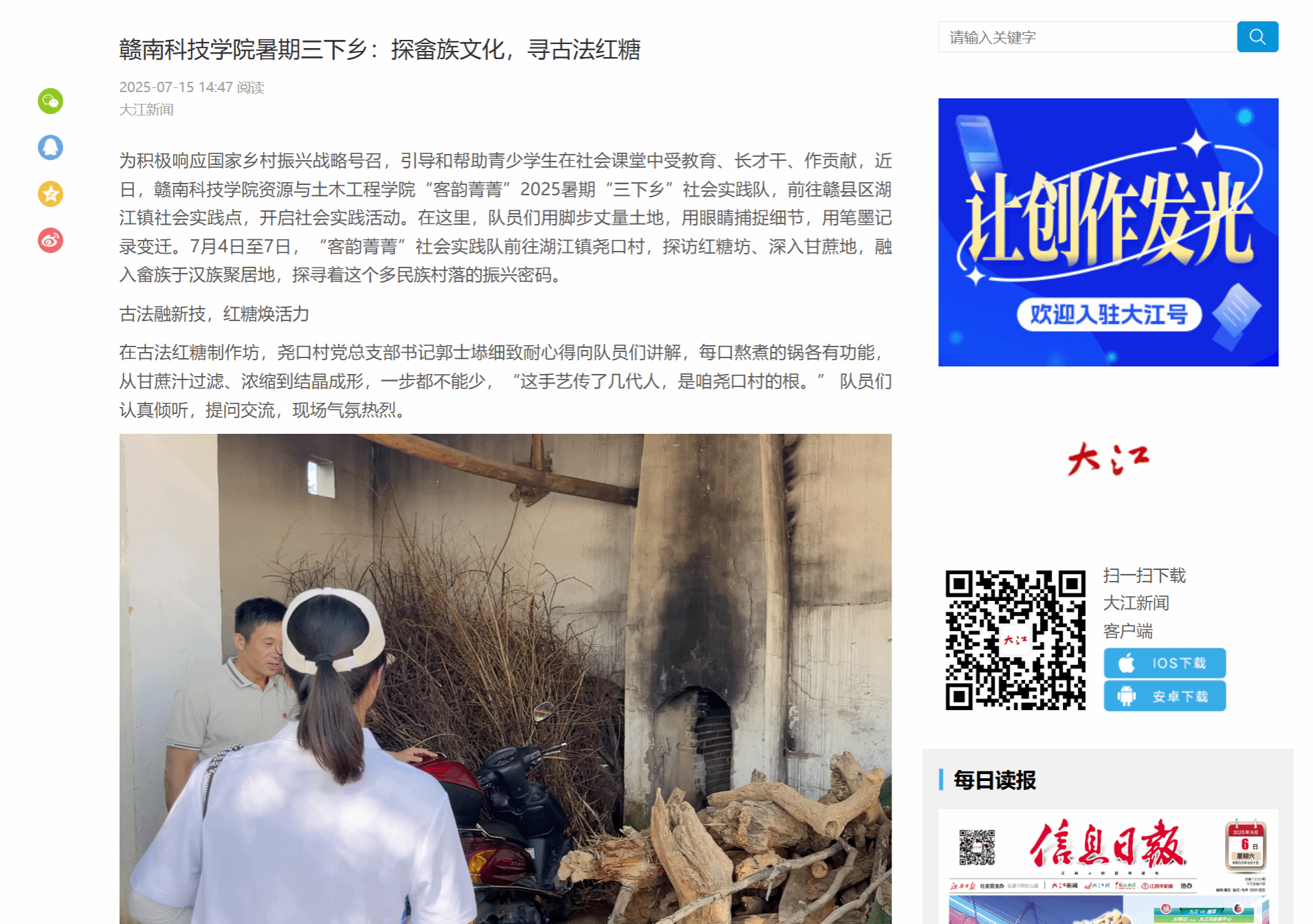 为积极响应国家乡村振兴战略号召,引导和帮助青少学生在社会课堂中受教育、长才干、作贡献,近日,金年会诚信信誉至上金年会jinnianhuicom“客韵菁菁”2025暑期“三下乡”社会实践队,前往赣县区湖江镇社会实践点,开启社会实践活动。在这里,队员们用脚步丈量土地,用眼睛捕捉细节,用笔墨记录变迁。7月4日至7日,“客韵菁菁”社会实践队前往湖江镇尧口村,探访红糖坊、深入甘蔗地,融入畲族于汉族聚居地,探寻着这个多民族村落的振兴密码。