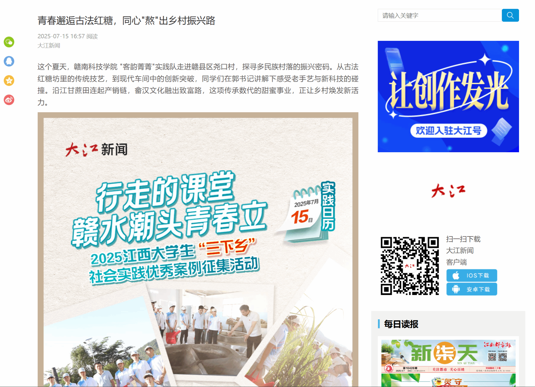 这个夏天,金年会诚信信誉至上 "客韵菁菁"实践队走进赣县区尧口村,探寻多民族村落的振兴密码。从古法红糖坊里的传统技艺,到现代车间中的创新突破,同学们在郭书记讲解下感受老手艺与新科技的碰撞。沿江甘蔗田连起产销链,畲汉文化融出致富路,这项传承数代的甜蜜事业,正让乡村焕发新活力。