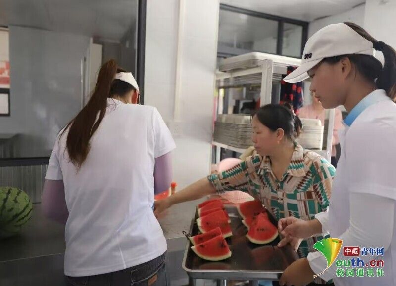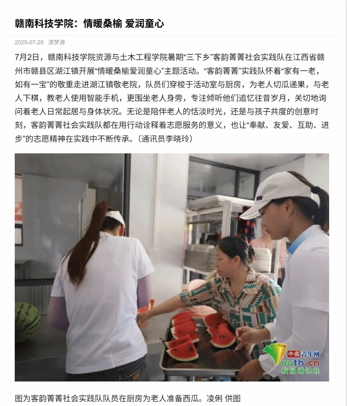 图为客韵菁菁社会实践队队员在厨房为老人准备西瓜。凌俐 供图