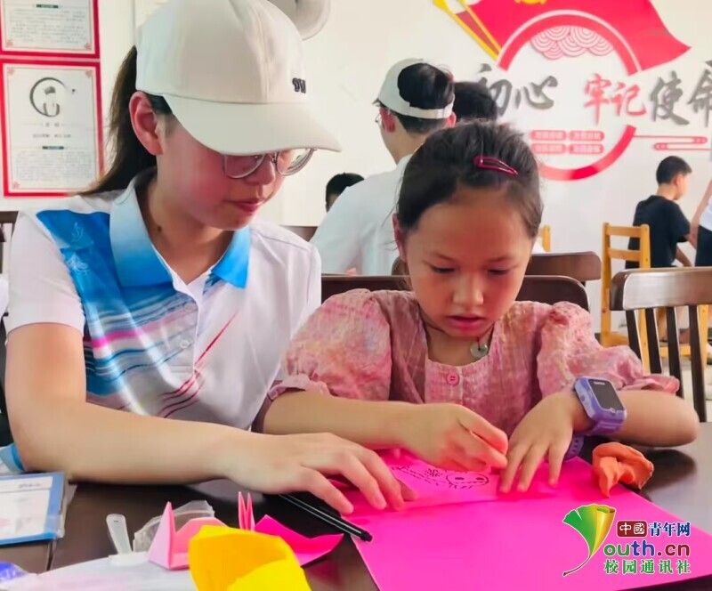 图为客韵菁菁社会实践队队员教小朋友做手工折纸。凌俐 供图