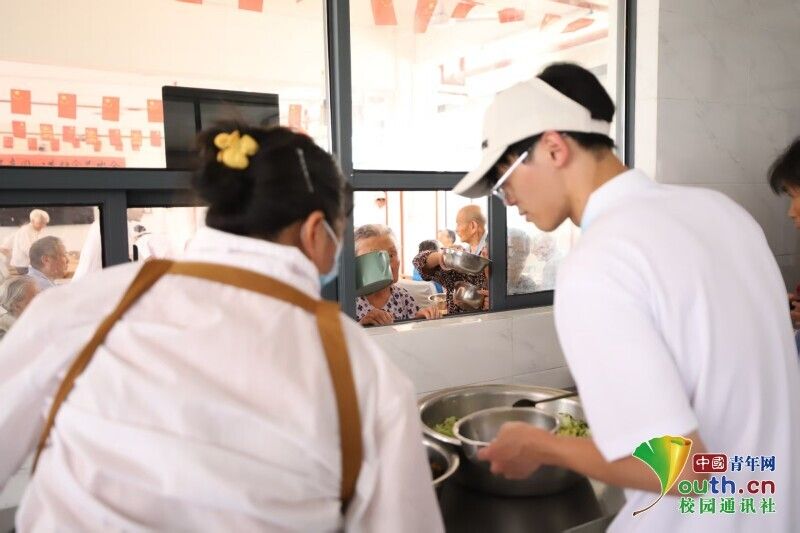 图为客韵菁菁社会实践队队员中午为老人打菜。凌俐 供图