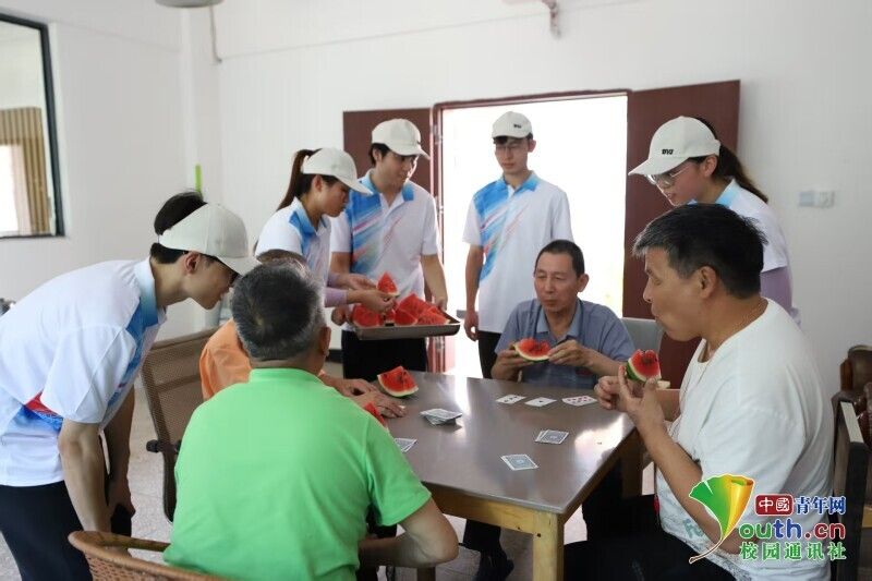 图为客韵菁菁社会实践队队员为老人递西瓜。凌俐 供图