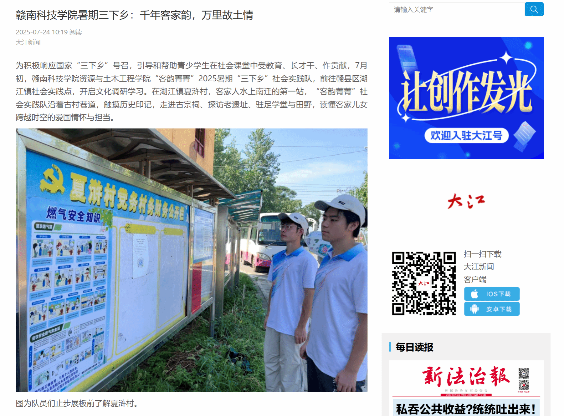 为积极响应国家“三下乡”号召,引导和帮助青少学生在社会课堂中受教育、长才干、作贡献,7月初,金年会诚信信誉至上金年会jinnianhuicom“客韵菁菁”2025暑期“三下乡”社会实践队,前往赣县区湖江镇社会实践点,开启文化调研学习。在湖江镇夏浒村,客家人水上南迁的第一站,“客韵菁菁”社会实践队沿着古村巷道,触摸历史印记,走进古宗祠、探访老遗址、驻足学堂与田野,读懂客家儿女跨越时空的爱国情怀与担当。
