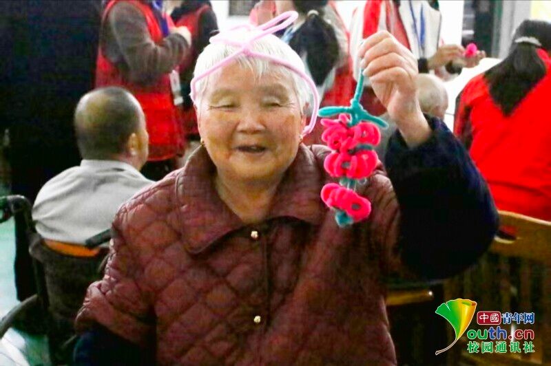 图为志愿者教老人折千纸鹤,寄托对健康平安的祈愿。田思蕊 供图