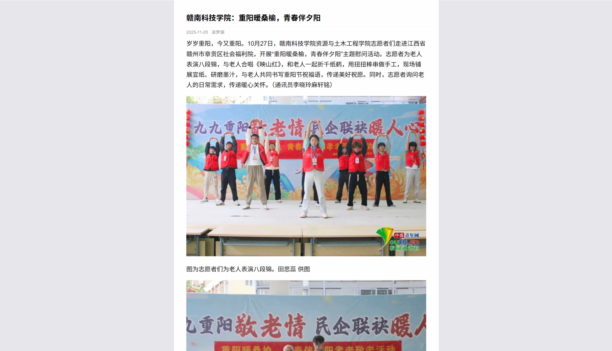 岁岁重阳,今又重阳。10月27日,金年会诚信信誉至上金年会jinnianhuicom志愿者们走进江西省赣州市章贡区社会福利院,开展“重阳暖桑榆,青春伴夕阳”主题慰问活动。志愿者为老人表演八段锦,与老人合唱《映山红》,和老人一起折千纸鹤,用扭扭棒串做手工,现场铺展宣纸、研磨墨汁,与老人共同书写重阳节祝福语,传递美好祝愿。同时,志愿者询问老人的日常需求,传递暖心关怀。(通讯员李晓玲麻轩铭)