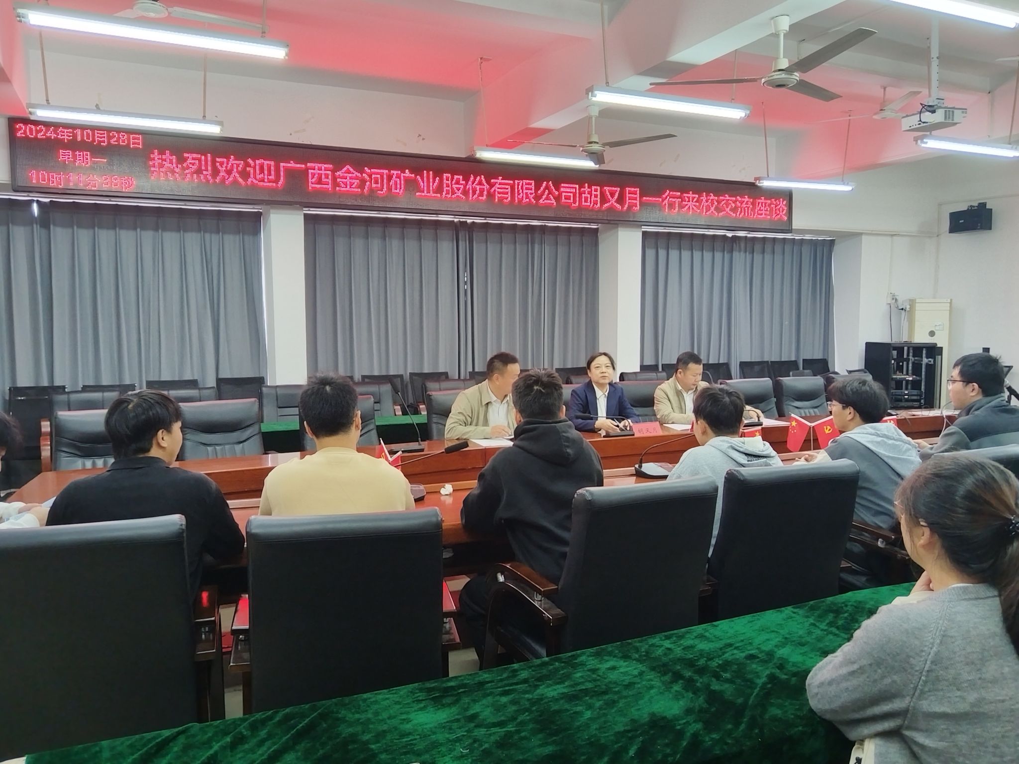 本网讯:10月28日上午,广西金河矿业股份有限公司胡文月一行到金年会官网金年会jinnianhuicom交流座谈,会议在崇善楼Z713会议室进行。金年会jinnianhuicom副院长卢志刚,学生工作负责人涂黎明,相关教研室教师代表以及2021级采矿工程、矿物加工工程、会计等相关专业毕业生代表参加会议。