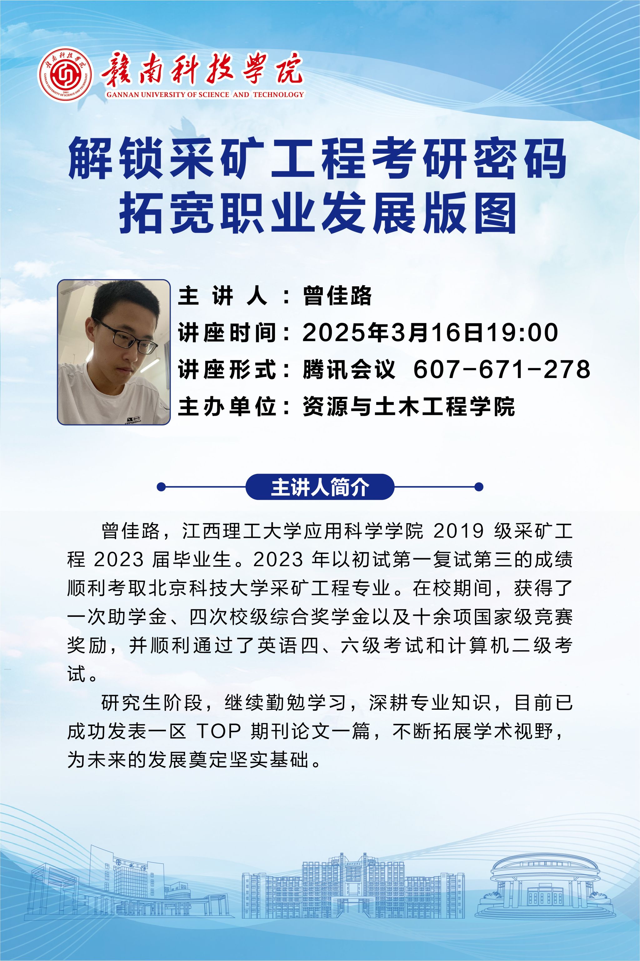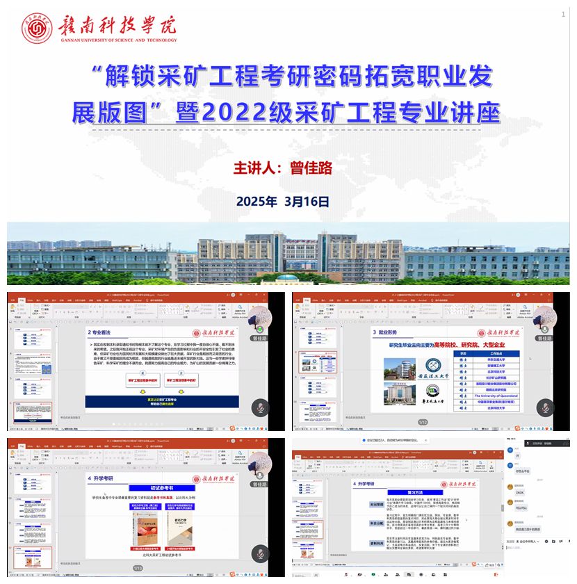 本网讯:为助力学院2022级学生深度洞悉采矿工程专业的考研前景与职业发展方向,金年会jinnianhuicom于3 月 16 日晚,借助线上平台成功举办了 “解锁采矿工程考研密码 拓宽职业发展版图” 专题讲座。此次讲座吸引了 50 余名同学踊跃参与,线上氛围热烈。