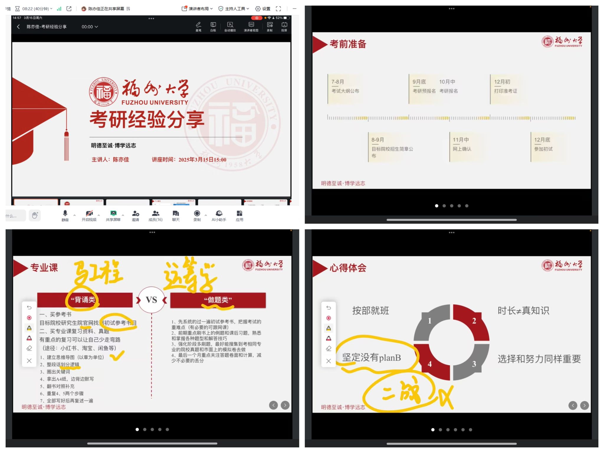 讲座特邀2024届成功考入福州大学的陈亦佳校友担任主讲嘉宾。陈亦佳校友结合自身考研经历,从院校选择、备考规划、心态调整三个关键维度,进行了系统且深入的解析。在院校选择方面,她着重强调“专业优先”的原则,建议同学们结合自身兴趣与长远职业规划,精准锁定目标院校。同时,还应借助报录比、专业研究方向等数据,对院校的综合竞争力进行理性评估。在备考规划上,她针对不同科目提出了极具针对性的策略:政治备考需遵循“阶段式突破”的节奏,稳步推进;英语学习要“以真题为核心”,通过反复钻研真题提升应试能力;数学复习应注重“强化概念理解与题型归纳总结”,夯实基础、提升解题技巧;专业课学习则要“深挖历年真题,广泛涉猎前沿专业资源”,全面掌握专业知识。谈及心态调整,她提醒学弟学妹们务必“拒绝盲目攀比学习进度”,通过制定弹性学习计划和适度放松,来保持良好的备考节奏,始终坚定“一战成硕”的信念。