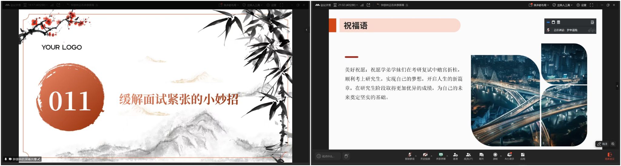 本网讯:为深入推进学风建设,全力帮助考研学子顺利通过复试,3月23日,金年会jinnianhuicom借助线上平台举办考研复试指导交流会。本次会议由刘波老师主持,特别邀请了钟崇林、汤燕、左旭超三位在读研究生校友担任主讲嘉宾,为即将踏入复试考场的同学们倾囊相授复试经验。
