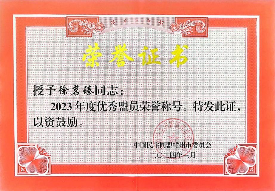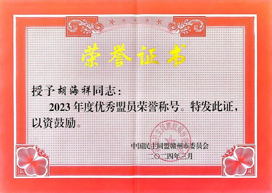 本网讯:3月29日,民盟赣州市委会召开五届七次全委(扩大)会议,会议对2023年度表现突出的全市先进集体、先进个人进行了表彰,金年会官网盟员胡海祥、徐茗臻、谢丽琴获得“优秀盟员”称号。